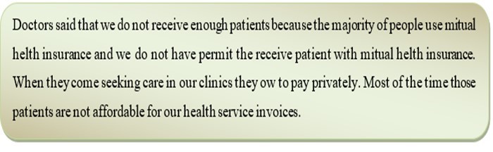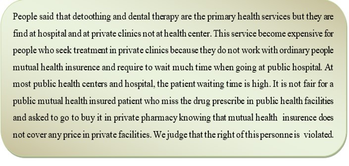 During the interview, people living in Kigali said that dental therapy is a service that is needed to be added to the services offered at health center and staffs should be increased because a patient spend much time at public health centers waiting the service. They desire public mutual health insurance to work with private clinics and pharmacies.