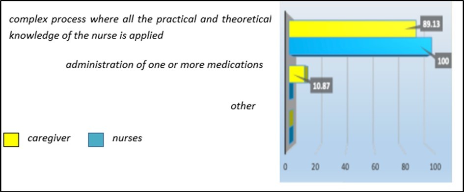 This graph shows that only 10% of the caregiver population consider therapy as a mere administration of drugs. Instead, all the nurses and about 90% of the rest of the caregivers seem to agree that therapy is something a little more complex than a simple administration of drugs. graph 1