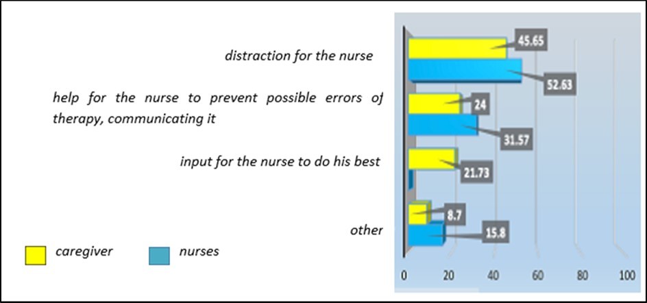 This graph provides us with information on how the presence of caregivers or family members can influence the moment of therapy. The opinion of nurses (52%) and caregivers (45, 65%) appears to be similar regarding regarding relatives as a source of distraction. However, about 30% of the nursing staff declare that the family member can help them in preventing any errors in therapy. Only 21% of caregivers think that family members themselves can act as input for the nurse so that the latter does his best. graph 7/8