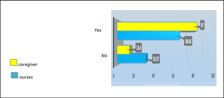 In total, a total of nineteen completed by nurses and forty-six completed by caregivers questionnaires were obtained. The data analysis is reported in the form of graphs performed with the EXCEL 2013 program.