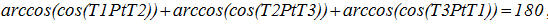 The values of the angles can be calculated using the vector dot product formula (similar to formula 5), for the angle T1PtT2 it will look like this: