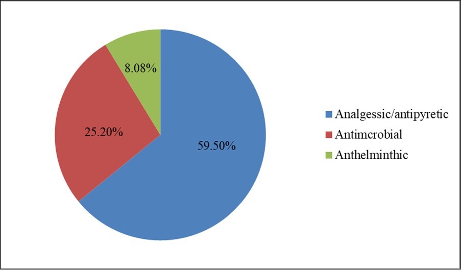 The most frequently used group of drugs used forself-medicationwere analgesics/antipyretics 177(59.5%)and antimicrobial which account 75(25.2%) each followed by antihelmenthics 24(8.08%) as shown in Figure 6 below.
