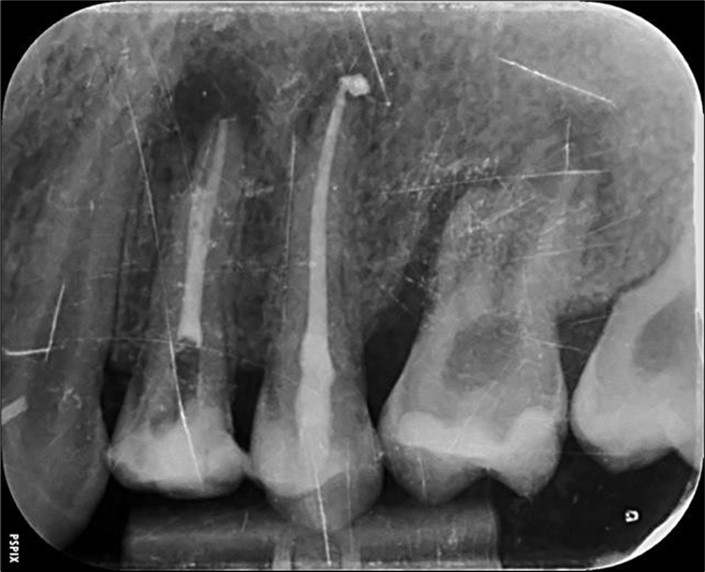3. Endodontic root canal treatment and retreatment were performed on teeth 14, 15, 16, 25, 26, 35, 36, and 46 using a K manual file 10/30/40/50/60/70 (Dentsply-Maillefer). Hyflex Edm (Coltene) 25/06 was used for the preparation of the canals, which were irrigated with 3% sodium hypochlorite and 17% ethylenediaminetetraacetic acid. Gutta-percha were calibrated to the diameter of the root apex constriction and obturation was conducted using Endosequence Bc Sealer (Brasseler) 15.