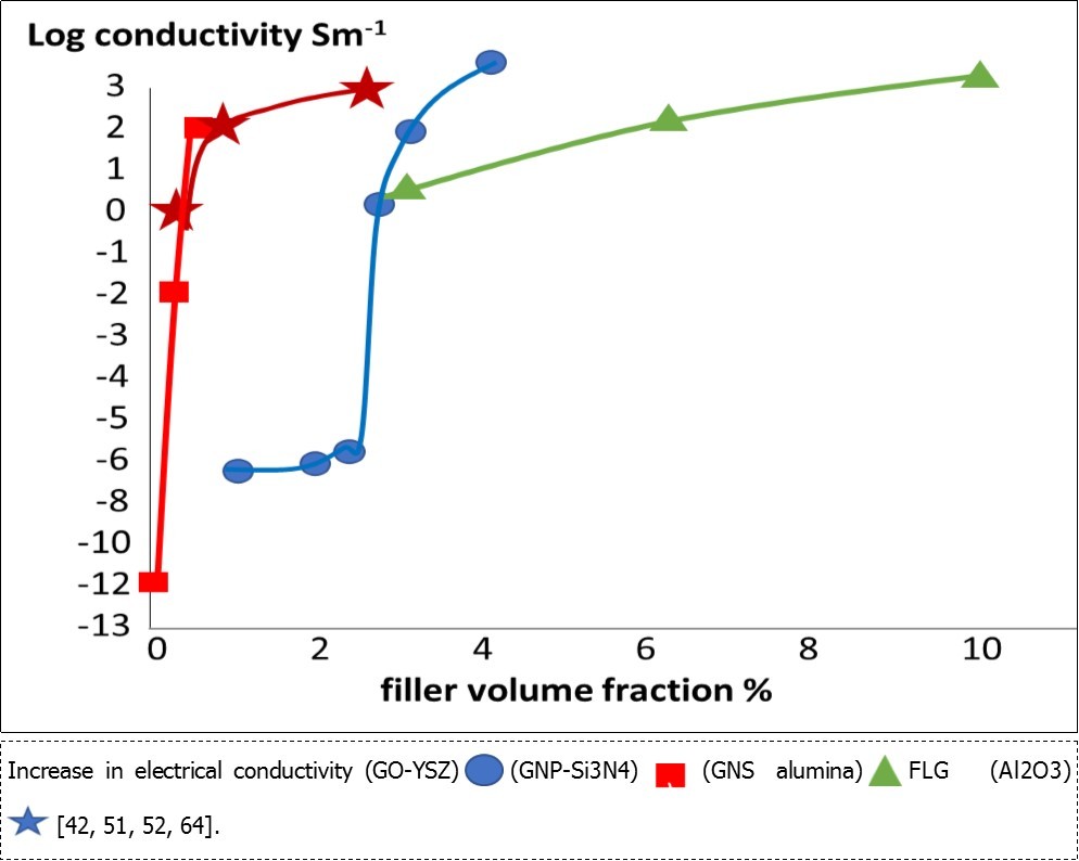 Figure 6.Increase in electrical conductivity (GO-YSZ) (GNP-Si3N4) (GNS alumina) FLG (Al2O3) [42, 51, 52, 64].