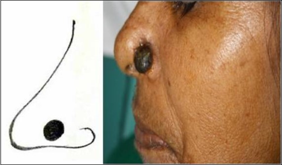 A 50 year old female patient reported to our department with complains of circular black discoloration on the left side of the nose, the discoloration has been slow growing and has reached the current state in a span of 3 years (Figure 1).There was no pain associated with it, but was aesthetically concerned with the lesion .Surgical excision and reconstruction of defect using bilobed flap was planned under general anaesthesia.