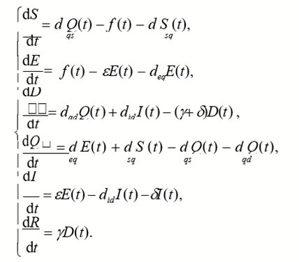 The incidence rate of the susceptible population S(t) was set as f(t), which to some extent can reflect the infection degree of COVID-19 in the susceptible population. The susceptible population in the free environment will become latent after being infected by COVID-19, and gradually develop after the incubation period. The proportion of latent persons who were converted to free infection was e, and the proportion identified as suspected cases was deq. After medical diagnosis, some of the suspected cases were confirmed, while others were not detected and returned to the susceptible population with a ratio of dqs. The susceptible population has also been converted to suspected cases at a rate of dqs. According to the above-mentioned population classification and parameter definitions, we have established a SEDQIR model based on SEIR, which can better reflect the spread of the COVID-19 in the population. 18 The SEDQIR model established based on the dynamic transmission mechanism of infectious diseases is as follows: