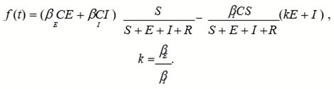 Among them, we refer to the infection rate coefficients of latent and freely infected people in susceptible populations as βE and βI. At this stage, the epidemic caused by COVID-19 may still be in the early stages of spreading among the population. We need to fit and estimate the above parameters through the original data published by the National Health Commission of China. Therefore, we will formulate the formula to a certain extent. Simplify: f(t) = β(t)(kE + I)