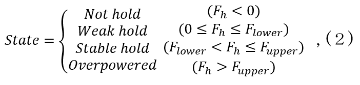 where Fhis the holding force (N), Flower is the required holding force calculated by Equation (3), and Fupper is calculated by Equation (4) and is the criterion for the limit of a stable hold for the object. Flower and Fupper are decided based on the weight setting.