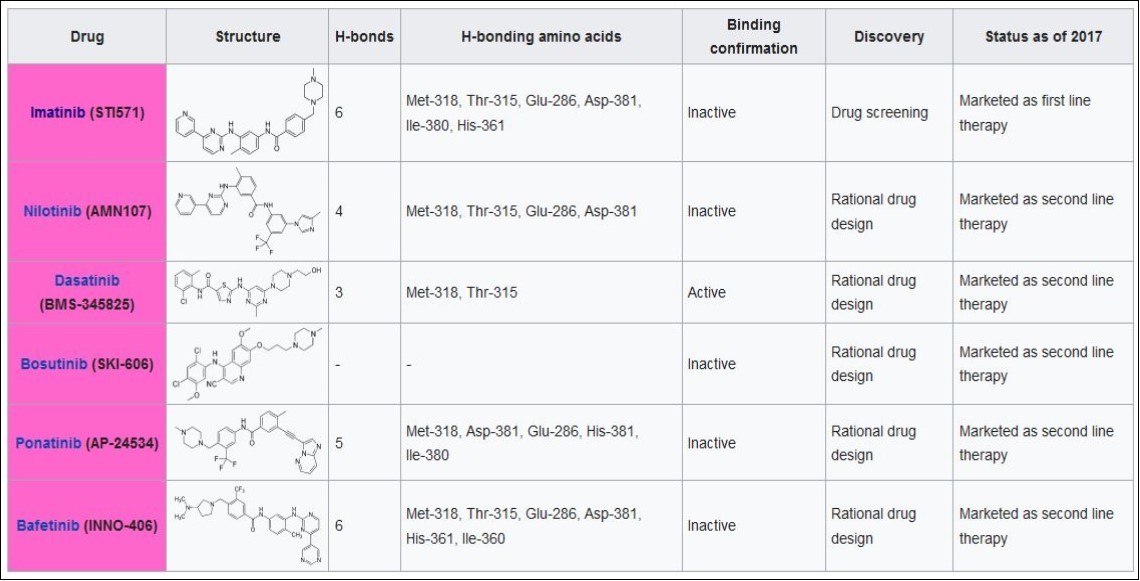 Imatinib remains a standard frontline Bcr–Abl tyrosine–kinase inhibitors (TKI) such as Imatinib (STI571), Nilotinib (AMN107), Dasatinib (BMS–345825), Bosutinib (SKI–606), Ponatinib (AP–24534) and Bafetinib (INNO–406). Nilotinib and dasatinib are also approved by the FDA as frontline drugs, in June and October 2010, respectively (Figure 1, Figure 2, Figure 3, Figure 4, Figure 5, Figure 6, Figure 7, Figure 8, Figure 9). Four of these drugs, nilotinib, dasatinib, bosutinib and ponatinib are approved for the treatment of imatinib–resistant or intolerant CML. The first–line data for these compounds are encouraging and suggest that some or all of them may replace imatinib as a frontline standard Bcr–Abl tyrosine–kinase inhibitors (TKI) such as Imatinib (STI571), Nilotinib (AMN107), Dasatinib (BMS–345825), Bosutinib (SKI–606), Ponatinib (AP–24534) and Bafetinib (INNO–406) in the future (Table 1) 257, 258, 259, 260, 261, 262, 263, 264, 265, 266, 267, 268, 269, 270, 271, 272, 273, 274, 275, 276, 277, 278, 279, 280, 281, 282, 283, 284, 285, 286, 287, 288, 289, 290, 291, 292, 293, 294, 295, 296, 297, 298, 299, 300, 301, 302, 303, 304, 305, 306, 307, 308, 309, 310, 311, 312, 313, 314, 315, 316, 317, 318, 319, 320, 321, 322, 323, 324, 325, 326, 327, 328, 329, 330, 331, 332, 333, 334, 335, 336, 337, 338, 339, 340, 341, 342, 343, 344, 345, 346, 347, 348. (Figure 1, Figure 2, Figure 3, Figure 4, Figure 5, Figure 6, Figure 7, Figure 8, Figure 9).