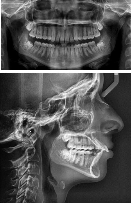 Figure 1.The OPG and ceph radiograph of our patient