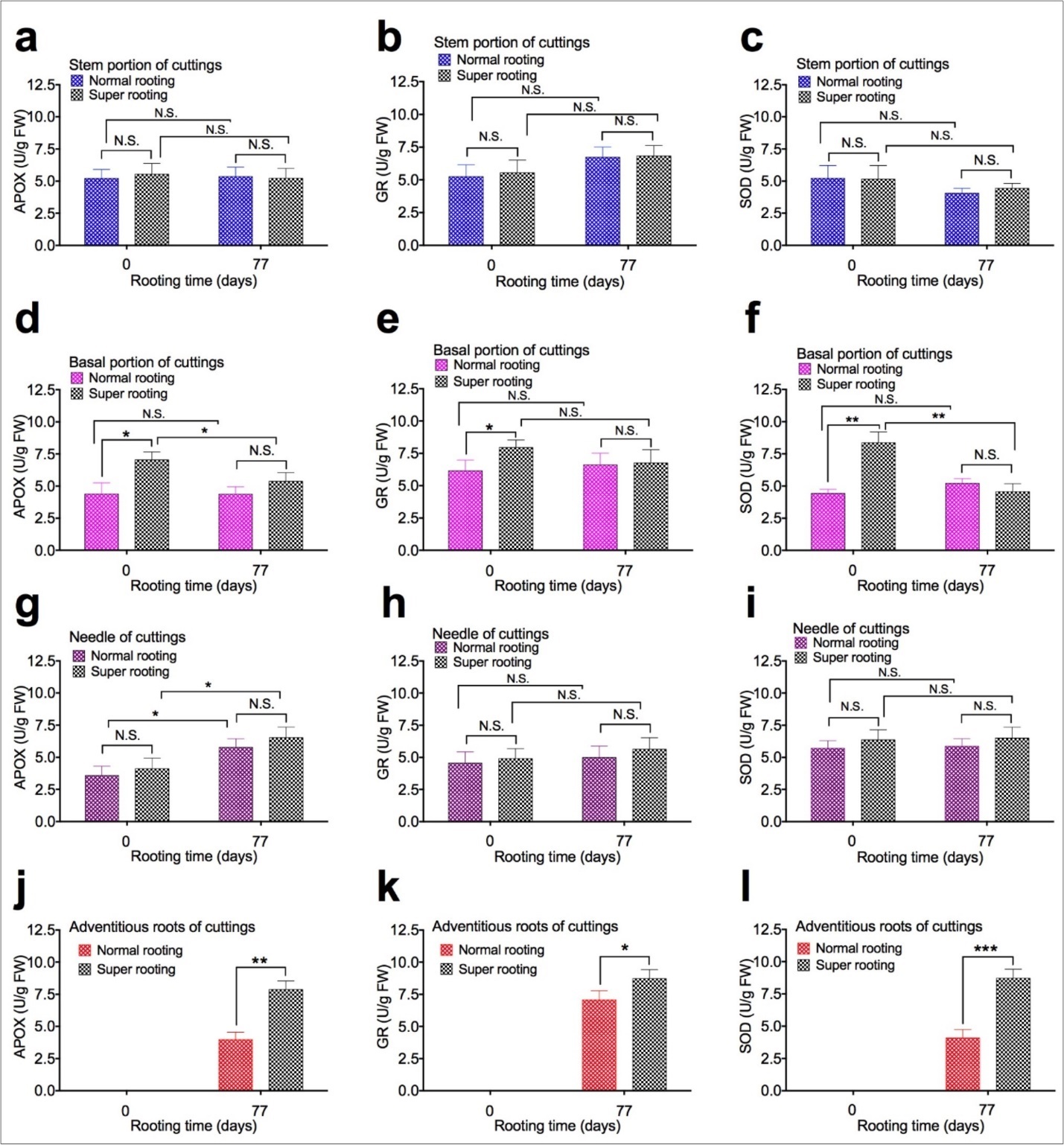 Figure 4.APOX, GR, and SOD activity in shoot cuttings of T. chinensis var. mairei at 0 and 77 days after planting. APOX (Figs. 4a, 4d, 4g, and 4j), GR (Figs. 4b, 4e, 4h, and 4k), and SOD activity (Figs. 4c, 4f, 4i, and 4l) in stem portion, basal portion, needles, and adventitious roots of rooted cuttings of T. chinensis var. mairei at 0 and 77 days after planting. Experiment was repeated five times. The statistically significant difference between groups was determined by one-way ANOVA. Data are presented as means of five independent experiments. Error bars represent standard error. The asterisk indicates significant differences compared to the rooted cuttings with low rate of root formation, as assessed by a t-test. *P<0.05, **P<0.01, ***P<0.001, significant relative to Phase I. N.S., no statistics significance.