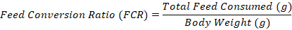 Measurements were taken at regular intervals, specifically on days 14, 21, 28, 35, and so on. FCR was standardized to a slaughter weight of 2,000 grams using the formula by Pesti and Rogers (1997). In addition, feed consumption was recorded at various times within a 24-hour cycle to determine relative feed intake, expressed as a percentage of total intake.