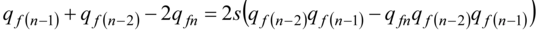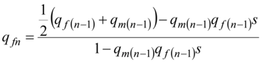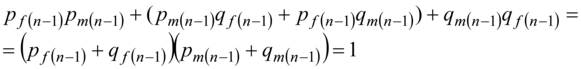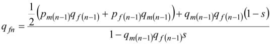 we find the sum of the genotypes frequencies in formula (3): 1 - qm(n-1)qf(n-1)s.
