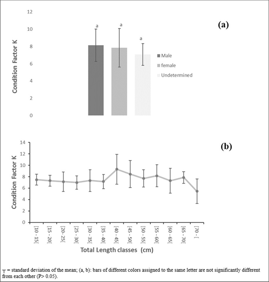 Figure 5a and Figure 5b illustrate how condition factor K varies with sex and total length class. In general, the values of this parameter ranged from 3.28 to 14.24 (mean: 7.80 ± 1.95). When considering the sexes, the highest values were recorded for males. In fact, the condition factor varied from 3.28 to 12.14 (mean = 8.13 ± 1.87) for males, from 3.63 to 13.28 (mean = 7.84 ± 2.23) for females, and from 4.95 to 10.14 (mean = 7.08 ± 1.26) for undifferentiated sexes. However, no significant differences in sex were found for this parameter (P>0.05).