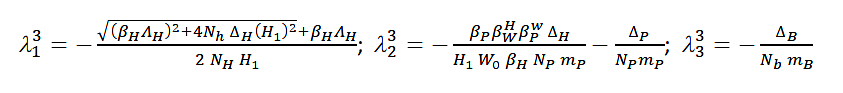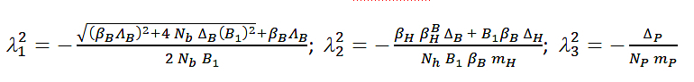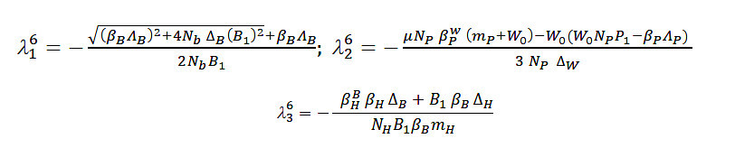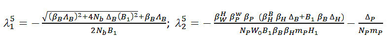 As can be seen above, the first eigenvalue depends exclusively on the parameters of the bats, while the second is a combination of the parameters between the three populations.