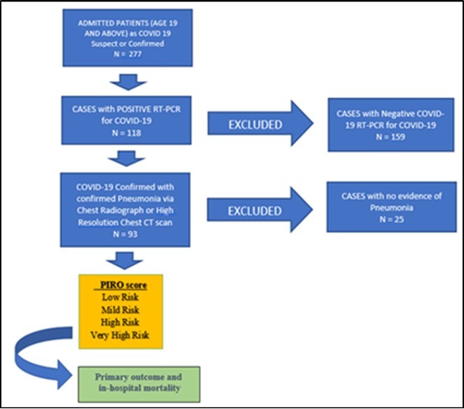 There were 277 subjects admitted as either COVID-19 Suspect or Confirmed. 159 subjects were excluded for testing negative for COVID-19 RT-PCR and 25 subjects were excluded for having no evidence of pneumonia either by chest radiograph or chest CT-scan. A total of 93 patients met the inclusion criteria and among these patients, 24 (26%) of which expired and 69 (74%) were recovered and discharged. There was statistical difference between recovered and expired patients in terms of Age, Hypertension, COPD, PIRO score and PIRO category.