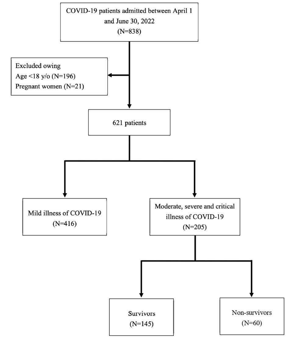 A total of 838 patients were assessed for eligibility, with 196 children (23.39%) and 21 pregnant women (2.5%) being excluded. 416 patients were excluded due to mild COVID-19 illness. Ultimately, 205 patients experiencing moderate to critical COVID-19 illness were enrolled in the final analysis (Figure 1). Amongst them, 60 patients (29.27%) expired and 145 (70.73%) survived, with the mortality rate within the moderate to critical illness COVID-19 patients being 29.5%.