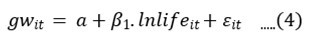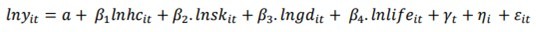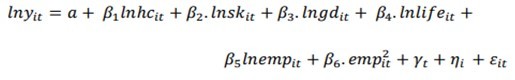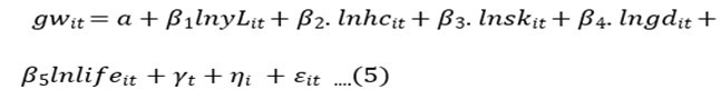 We estimated a simple liner regression model just to see what the linear relationship between the two variables we are using specification 1 and 4, in which we found a strong positive correlation between the variable. In our empirical specification we know gw is the growth rate par GDP capita, lnyL is the previous period GDP, emp is the employment rate or in other words the span of period an individual is engage, lnsk it’s the capital accumulation, gd is the growth rate of the population and ln life is the life expectancy of individuals. We could say γt is the time fixed effect or in other words year dummy and ηj is the country fixed effect or in other words country dummy. The last term refers to the idiosyncratic error term.