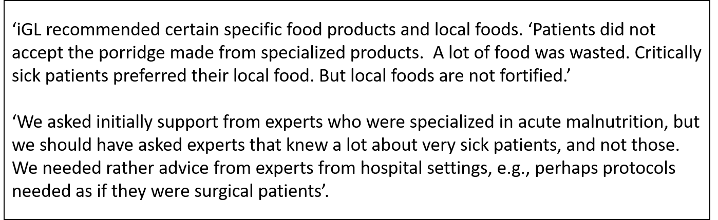 One-third of the KIs found the 2014 iGL not to be sufficiently practical. While the technical aspects were acceptable, the feasibility was questioned. Protocols developed by individual organizations were more detailed on what types of foods to provide and how. However, at least half of the KIs stated that the 2014 iGL were still useful, especially the decision tree. KIs stated that despite the lack of evidence base for the 2014 iGL, it provided some guidance, especially in the beginning of the West Africa outbreak. Most KIs agreed it was essential to develop the guidance continuously and to contextualize it within the countries affected.