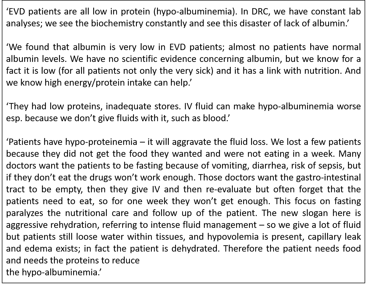 Four KIs (3 medical doctors, 1 nurse/nutritional manager) expressed significant concerns on hypo-albuminemia in EVD patients. The following captures the concern of practitioners:
