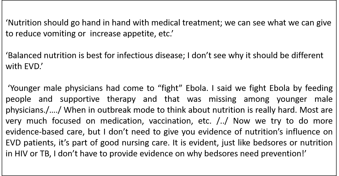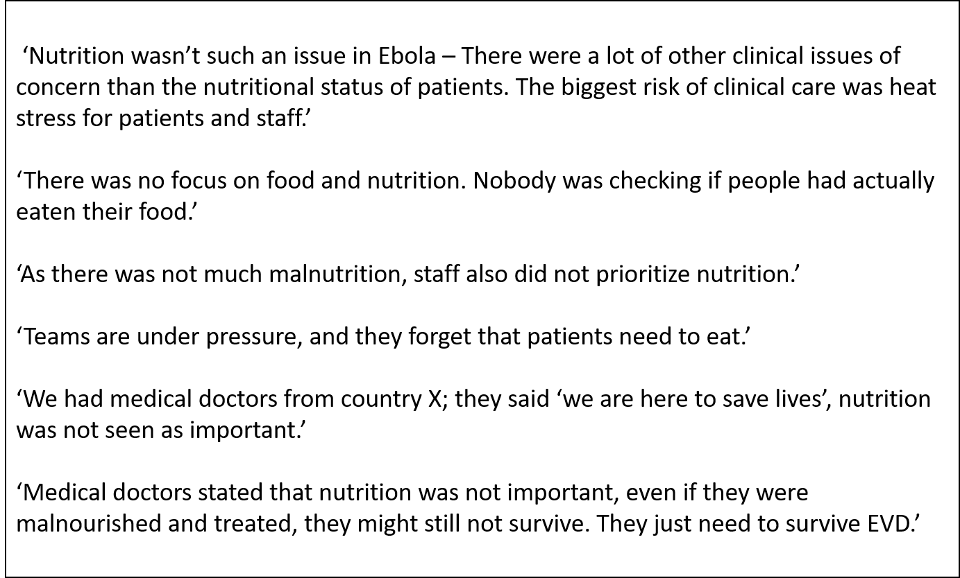 KIs and their colleagues perceived the importance of nutritional care in EVD patients in different ways. Although most KIs noted the importance of the role of nutrition in patient care, some KIs mentioned that clinical staff was predominantly concerned with medical treatment: