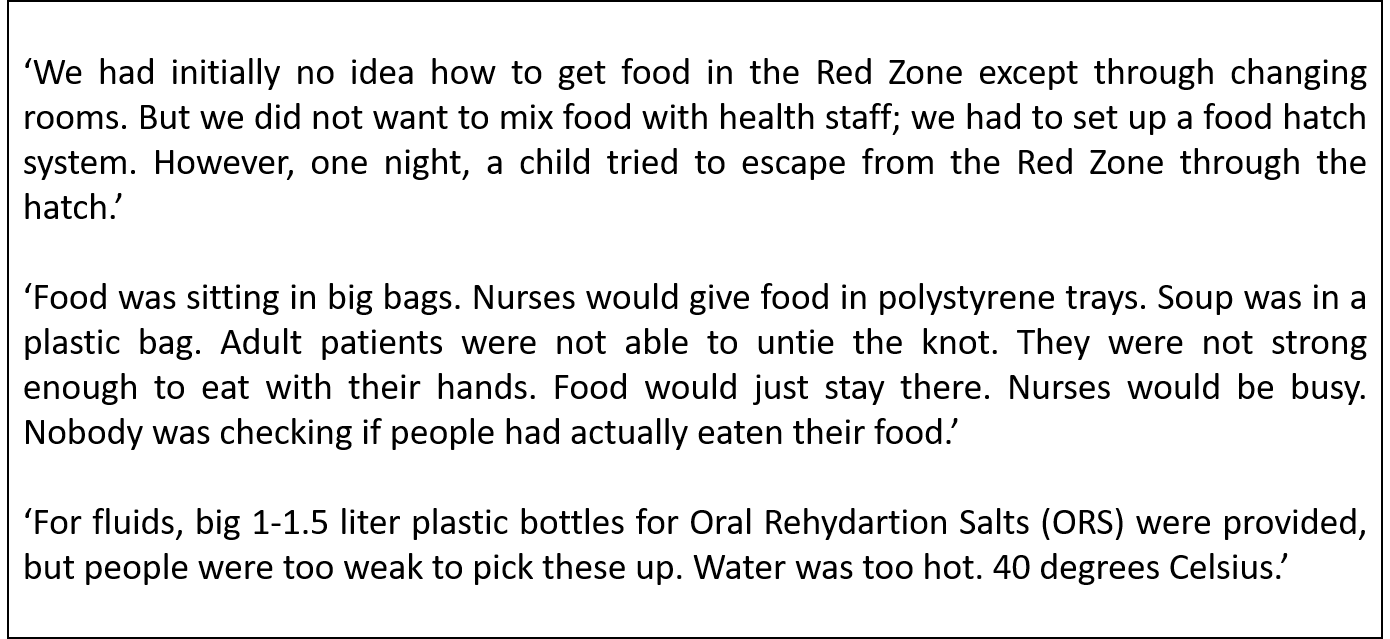 Various KIs mentioned the important role of foods for patients’ morale. They stated that this possibly contributed to patients’ recovery. One medical doctor noted it was also crucial for the morale of health workers: The fact we did not look at the nutrition well had a big impact; the health staff asked us why we could not do more for the EVD patients concerning foods. We did not, and this was bad for the staff’s morale as well for the patients. It was difficult for the health workers not to provide what the EVD patients wanted. The patients needed to eat, patients wanted to eat certain things, and we didn’t give that. It demotivated the staff, and also posed ethical problems for them. It was also demoralizing for patients.’