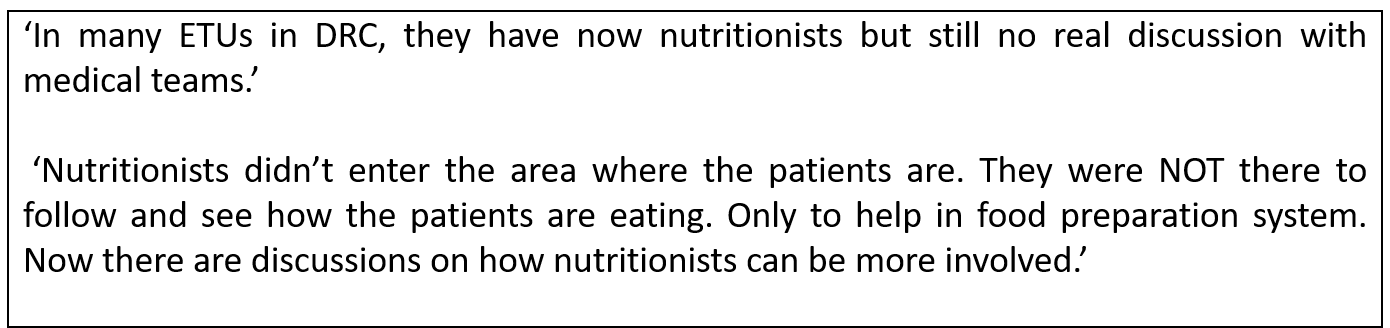 The turnover among clinical staff and the limited interest and knowledge on nutrition was not conducive for the patients’ care and nutritional needs (especially among foreign medical staff). There was a need for constant (re) training on nutritional care and food hygiene. It was felt that the presence of nutritionists had been essential for improved nutritional care, and those that directly accessed the patients within the ETU were able to adjust initial protocols that were inadequate.