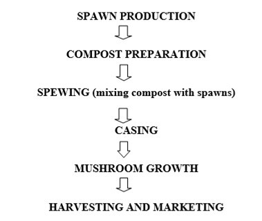 Milky mushroom was grown on various substrates like paddy straw, wheat straw and vegetable plant residues. But, paddy straw is easily available and cheap, it is commonly used. Paddy straw used was fresh and well dried. Paddy straw was soaked in fresh water containing formalin (500 ppm) and Carbendazim (75 ppm) for more than 12 hours(4). Drain off the Excess water from straw by spreading it in jute cloth. In synthetic compost, wheat straw is supplemented with nitrogen nutrients, organic and inorganic. In organic compost, horse dung is added. The compost can be prepared by long or short composting method. Only those who have pasteurizing facility can employ short cut method. Good compost is dark-brown, ammonia free, little greasiness and having 65-70% moisture.