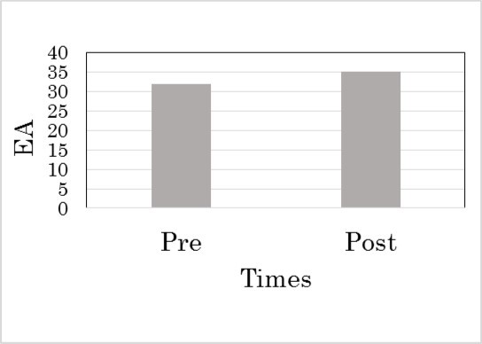 Then the EA score at the pre intervention was 32.1 point in this study. Since the standard mean score was 24.0 point, the EA in this study was high. As for effects, the EA score significantly increased from 32.1 to 35.1 (p<0.05) Figure 2.