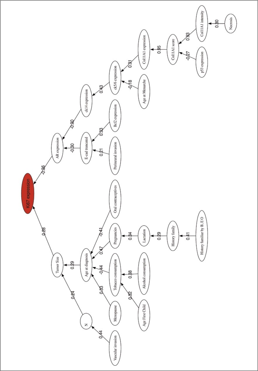 The correlation network shows two main branches connecting Ki67 expression to Tumor size and AR expression, both with low correlation coefficients. Two branches start from AR through CK14 expression and E-cad truncated, both weakly correlated to the AR node with negative coefficients. In the tumor size branch, all the variables seem to be related to habits and clinical features, Age at diagnosis, Menopause, Tobacco smoking, Oral contraceptives, etc. The low correlation among all these variables implies that they should be considered as independent prognostic factors. This graphic also confirms the strong correlation between the three representations of the Col11A1 protein. The role of the Androgen Receptor in breast cancer has been reviewed by 40, concluding that AR expression might play a role during tumor progression. Although histologic grading has become widely accepted as a powerful indicator of prognosis in breast cancer, no connections with other biomarkers has been made relevant. In our opinion this is one major findings of this research that will serve to improve the actual methods of prognosis.