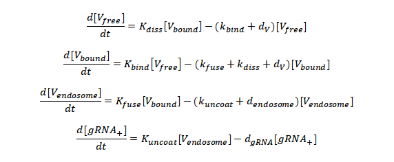 The equations that describe the process of the cell entry are the same ones used by Grebennikov et al 7.There are four differential equations, where the free virions outside of the cell ([Vfree]) will be binding the ACE2, and activated by TMPRSS2 ([Vbound]), while that [Vendsome], and [gRNA+] are the number of virions in endosomes and the number of ss-positive sense genomic RNA, respectively. The equations are