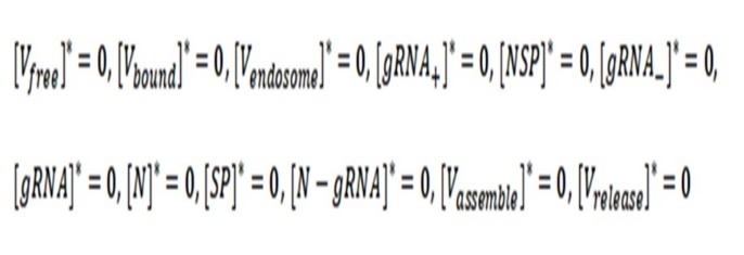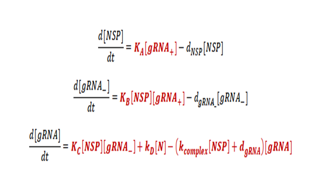In this step, Grebennikov’s model proposes three differential equations, but we modified it (the changes are indicated in red color), where the first equation, NSP, takes into account the abundance of nonstructural protein populations, while that [gRNA-] takes account the negative sense genomic and subgenomic. Finally, the last equation is completely different from Grebennikov's model which describes [gRNA]