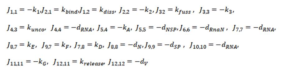 The next step is to calculate the Jacobian of the system and evaluate it at this critical point. We only showthe non-zero terms of the Jacobian (J), where the order of the subscripts correspond to the row, column of the Jacobian matrix, respectively; that is, J4,3 corresponds to the value of the matrix at row position 4, column 3 of the resulting Jacobian matrix. Thus, all non-zero terms are