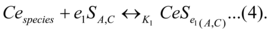 (Figure 6) shows the possibility of studying the role of ionic dissociation on the effect of surfactants in the emulsion carrier. Assuming that, in each range of Hy-1622 concentration, the cation surfactant and substrate can relate together and an equilibrium relation exists. The Hy-1622 concentration in which the equilibrium relation between the added cationic surfactant and the ions species existing in the solution, study the equilibrium between cationic-nonionic surfactants and complex produced from equilibrium surfactants and equilibrium equations (4,5). Cerium ion species in previously Figure 6 represent Ce(OH)4 or Cespecies in equilibrium step 1 and 2(e1,2) and S (A,C) anionic and cationic surfactants.