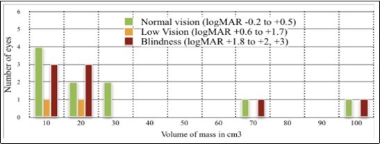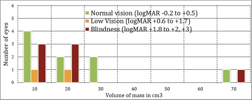 The largest mass measuring 98.55cm3and the smallest mass measuring 6.89cm3both had a BCVA of the poorer eye (>2 logMAR units). Also, the largest mass had one eye with normal vision showing the asymmetrical visual involvement. (see table 9).