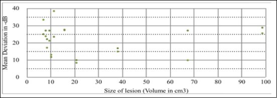 Considering AVF perimetry Mean Deviation and size of the lesion (in cm3), an eye of the patient with a large lesion (67.30cm3) had a MD of <10 dB, while an eye with MD of more than 30 dB had a small lesion (6.89cm3).