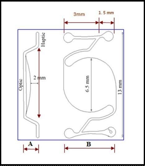 Figure 2.Intraocular lens design, with posterior chamber optic and angle-supported haptics. Lateral view (A) and anterior view (B) with different IOL dimensions.