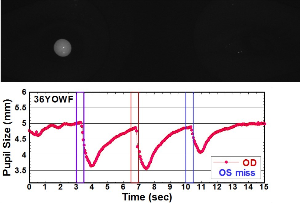 Figure 5 is the pupillogram of a case of positive relative afferent pupillary defect (+RAPD) that was caused by a trauma incident. Unfortunately, this eye also suffered from cataract and strabismus (ET). As a result, the automatic analysis computer-code failed to find the left pupil due to the low signal-level in the infrared photograph. Thus, the left eye data were missing in the pupilogram analysis. The pupilogram indicated that as the screen illuminated the right eye, the right pupil contracted from 4.9mm to 3.55mm. When the screen light illuminated only the injured left eye, the optic nerve could transmit light but contraction occurred to a lesser degree from 4.9 mm to 4.1 mm. The brain interprets this as a decrease of light level, and the brain's response is to have both pupils contract less to admit more light in. Despite only one eye being illuminated, this dilation response was observed in both eyes. This was identified when we manually examined the video images. The clinician also validated that this eye responded to light but to a lesser degree.