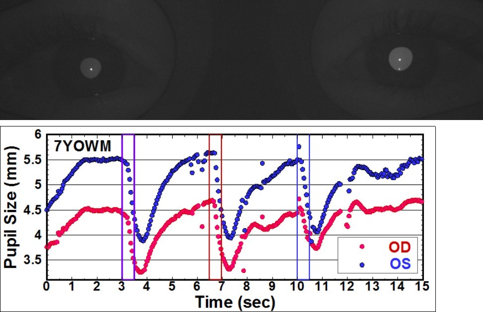 3)IRL-APD. The infrared images in Figure 6 revealed the dark-adapted (upper image) and the illuminated and contracted (middle image) pupils. Both showed an apparent difference in size between two pupils. The pupilogram showed the magnitudes of photopic and scotopic anisocoria. The missing and scattered data points in pupillogram are caused when the 7-year-old young patient blinked and looked away from the screen.