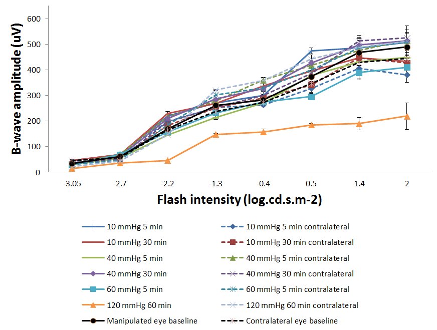 We have used electroretinogram (ERG) responses to measure retinal function. ERG responses in rats have been shown to be affected after IOP increase, with components of the ERG response showing differing levels of sensitivity to varying degrees of IOP elevation,17, 18. The negative and positive scotopic threshold response (nSTR and pSTR, reflecting retinal ganglion cell function) and photopic b-wave (bipolar cell function) were the most sensitive ERG components, being consistently reduced and delayed immediately after 75 minutes of IOP increase to 30 mmHg, and were completely abolished after 75 minutes of IOP at 70 mmHg,17. The most resilient ERG component was the a-wave (photoreceptor function), being the only component still present after 75 minutes of IOP at 70 mmHg,17. At IOPs above 70 mmHg, all components of the ERG were diminished,17. Therefore an IOP increase seems to affect cell function in the inner retina first, at an IOP level of 30 mmHg, followed by cell function in the middle and outer retina at progressively higher IOP levels.