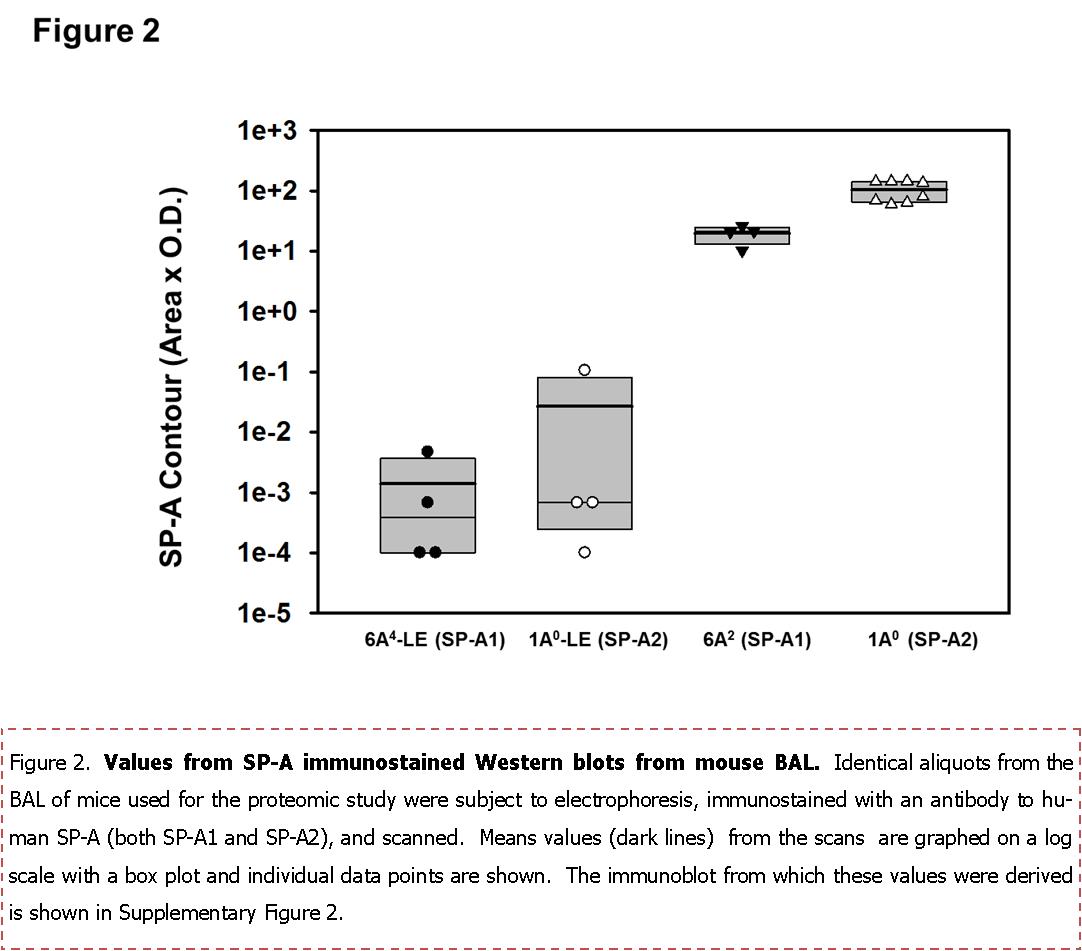 Figure 2.Values from SP-A immunostained Western blots from mouse BAL. Identical aliquots from the BAL of mice used for the proteomic study were subject to electrophoresis, immunostained with an antibody to human SP-A (both SP-A1 and SP-A2), and scanned. Means values (dark lines) from the scans are graphed on a log scale with a box plot and individual data points are shown. The immunoblot from which these values were derived is shown in Supplementary Figure 2.