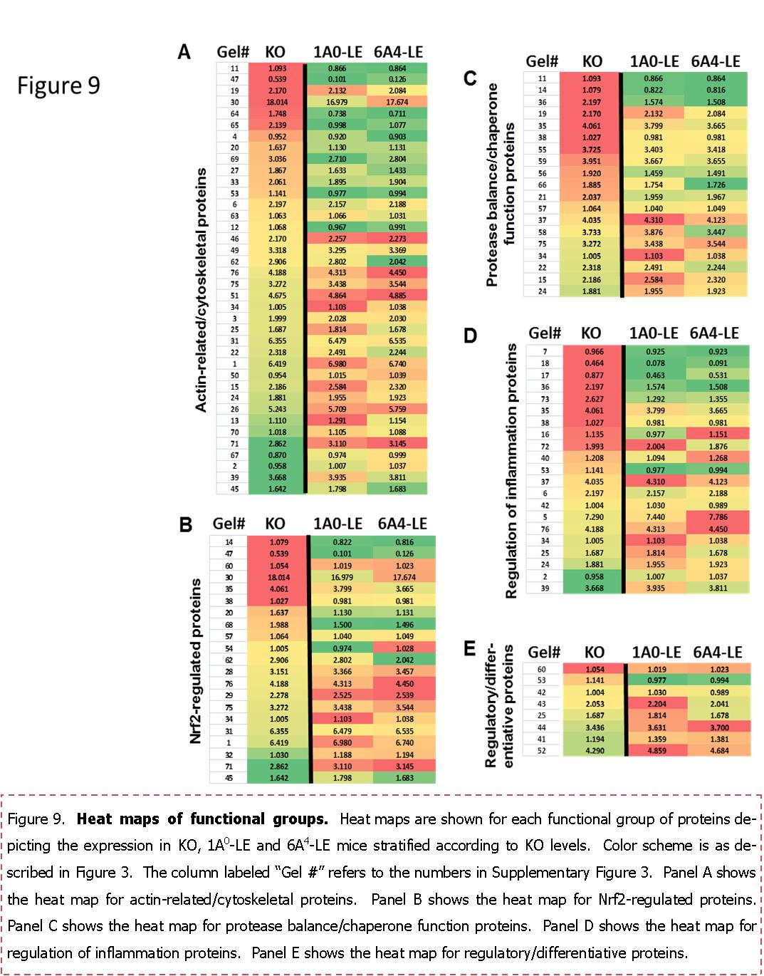 Supplementary Figure 4Heat map of all proteins. A heat map is shown for WT mice, KO mice, and all of the transgenic lines used in this study. The protein order is arranged based on levels of expression in 1A0 mice. Red bars have the highest levels, yellow are in the middle of the range, and green are lowest. Intermediate levels are colored with the appropriate shades. The column labeled “gel#” indicates the number of a given protein in the reference gel (Supplementary Figure 3). The numbers in each bar indicate the average normalized volume for the spot/s representing each protein.