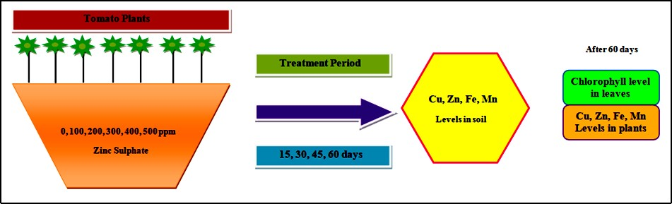 Lycopersicon esculentum seedlings were collected from the field and they were transplanted to soil containing different concentrations of zinc sulphate (100, 200, 300, 400 and 500 ppm). Treatment concentrations of zinc sulphate were selected based on the literature. The plants were grown in triplicates in pots of two kg capacity. They were watered in morning and evening and exposed to normal photoperiod. Plants from each concentration of zinc sulphate were removed at an interval of 15, 30, 45 and 60 days of treatment. The soil has been subjected to AAS analysis for detecting the concentrations of copper, zinc, manganese and iron in the soil.