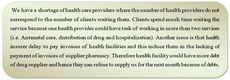 During the interview, the representative of health centers said they do not have sufficient health care providers comparing with their daily clients, this is justified by the waiting time of clients. Another need is a regular payment of invoices by health insurances. The head of health centers explained in the following way: