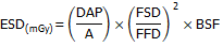 Where, A is the area of radiation field on the patient skin (cm2), DAP: dose measured by DAP-meter (mGy×cm2), FSD: x-ray focus to skin distance (m), FFD: x-ray focus to film distance (m) and BSF: back scatter factor.