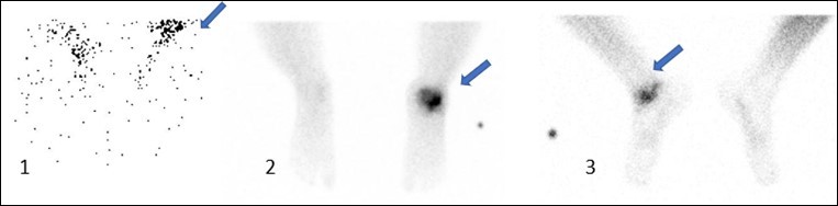 Single photon emission computed tomography with CT (SPECT-CT) is an emerging diagnostic modality that combines the sensitivity of bone scintigraphy with the high specificity of CT . It has an advantage of showing the bones’s metabolic activity that surrounds the prosthesis and is less prone to be affected by metal artifact compared to MRI15 . It reflects the physiological activity of the bone and combines the anatomical and functional data and increases the diagnostic yield of the scan to evaluate the viability and integrity of the allograft during follow up. Three phase component of the bone scan reflects the integrity of the graft as it indicates the blood flow . 16An uptake is elevated by the repair and remodeling of the bone , inflammation , and increase in blood flow. Thus , measured uptake over time by bone scintigraphy can be used to study the bone remodeling. 17Radiopharmaceutical accumulation in the bone graft is accepted as the evidence of bone viability and patency of microvascular anastomosis. Negative scans after postoperative one week are always related with complications and not increase in the uptake in the following 1-3 months shows complications of graft. Sequential bone scans are thus required to monitor the viability of the graft based on the uptake in the graft region. 18, 19, 20