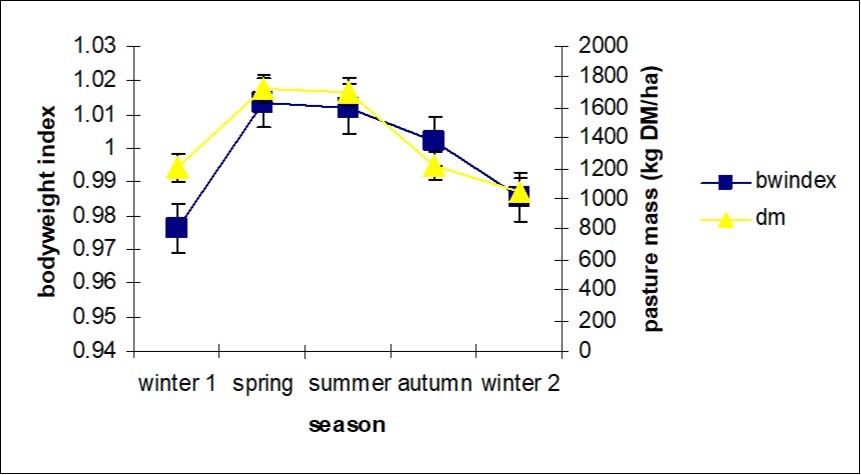 Figure 1.Mean bodyweight index (bwindex) of 48 Pony Club horses that were examined monthly for 10-13 consecutive months and mean pasture mass (dm) on visit day in paddocks grazed by these 48 horses by season