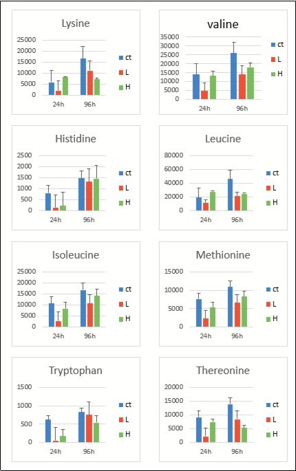 Figure 3.Levels of essential amino acid at 24 and 96 h of exposure for the control group (blue), L group (red), and H group (green) in liver of carp fish. The values on the y-axis were normalized, divided by fish weight, and multiplied by 105 (unit, mg−1). Results are represented as means ± SE.